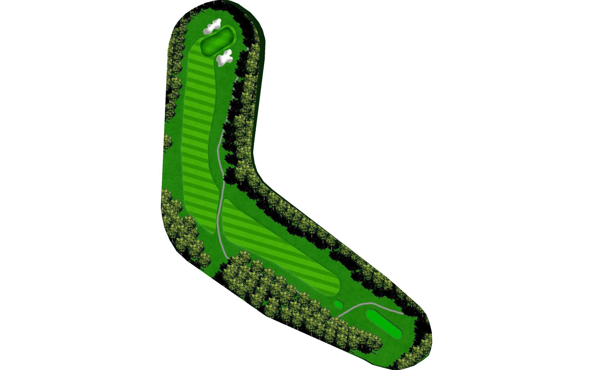 A dogleg right par 4 with a downhill tee shot and an uphill shot into the green. A tee shot to the corner will give you a mid iron but a long cut shot could give you a wedge into the green. Avoid the trees and penalty area on the right.