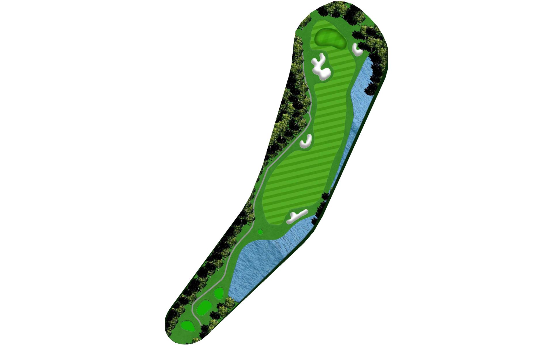 Hitting a good drive on this hole is more important than a long drive. Avoid the bunkers and water down the right hand side of this hole. Aim left center of the fairway, avoid the trouble on the right hand side of this hole and you set yourself up for a good chance at par.