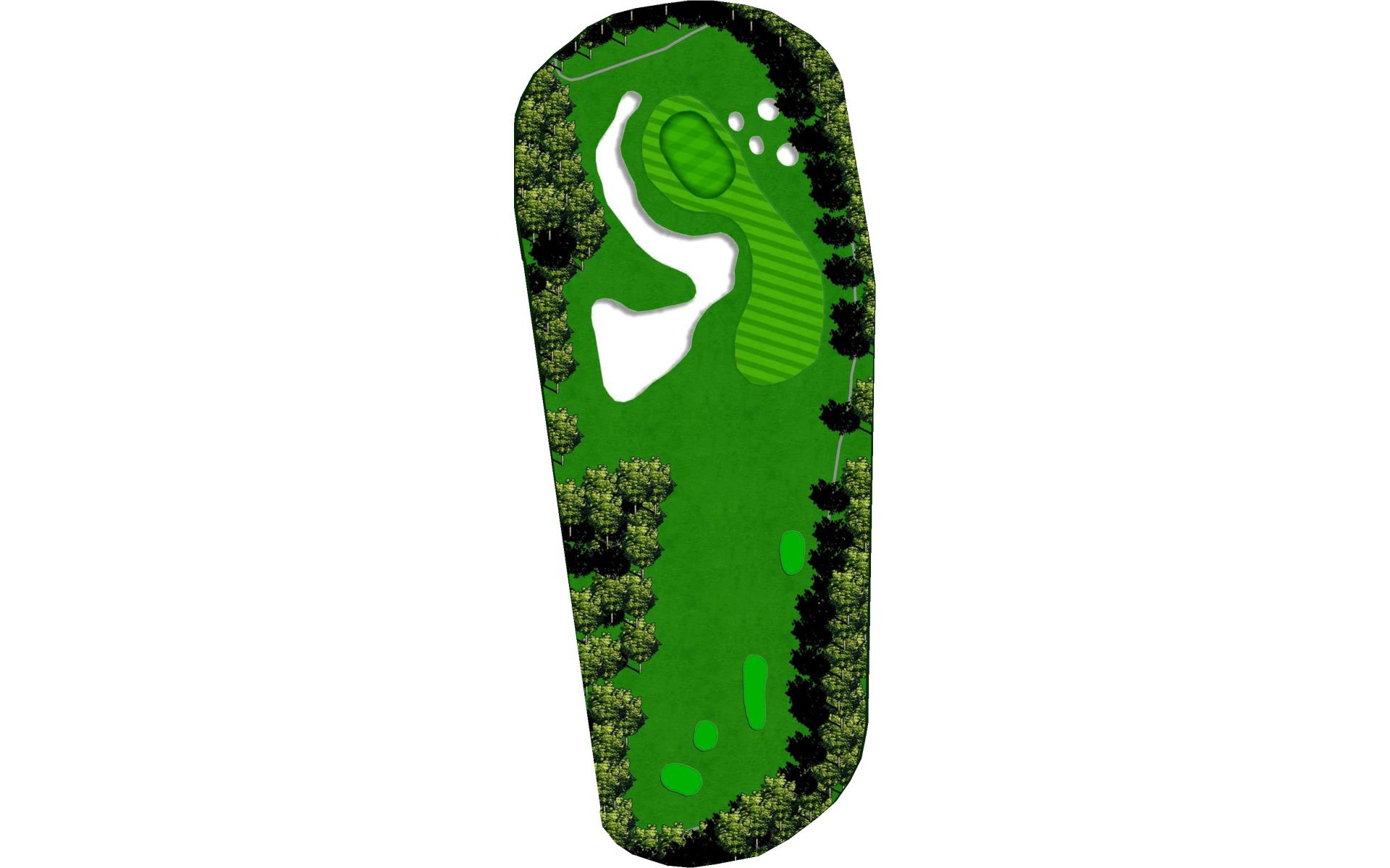 This may be the toughest tee shot on the course. A good drive here would be just to the right of the mound on the left. A good tee shot will leave a short iron or wedge, but beware as it is downhill to a smaller green. DO NOT go long on this hole, as you will be in jail facing a downhill pitch with minimal green to work with.